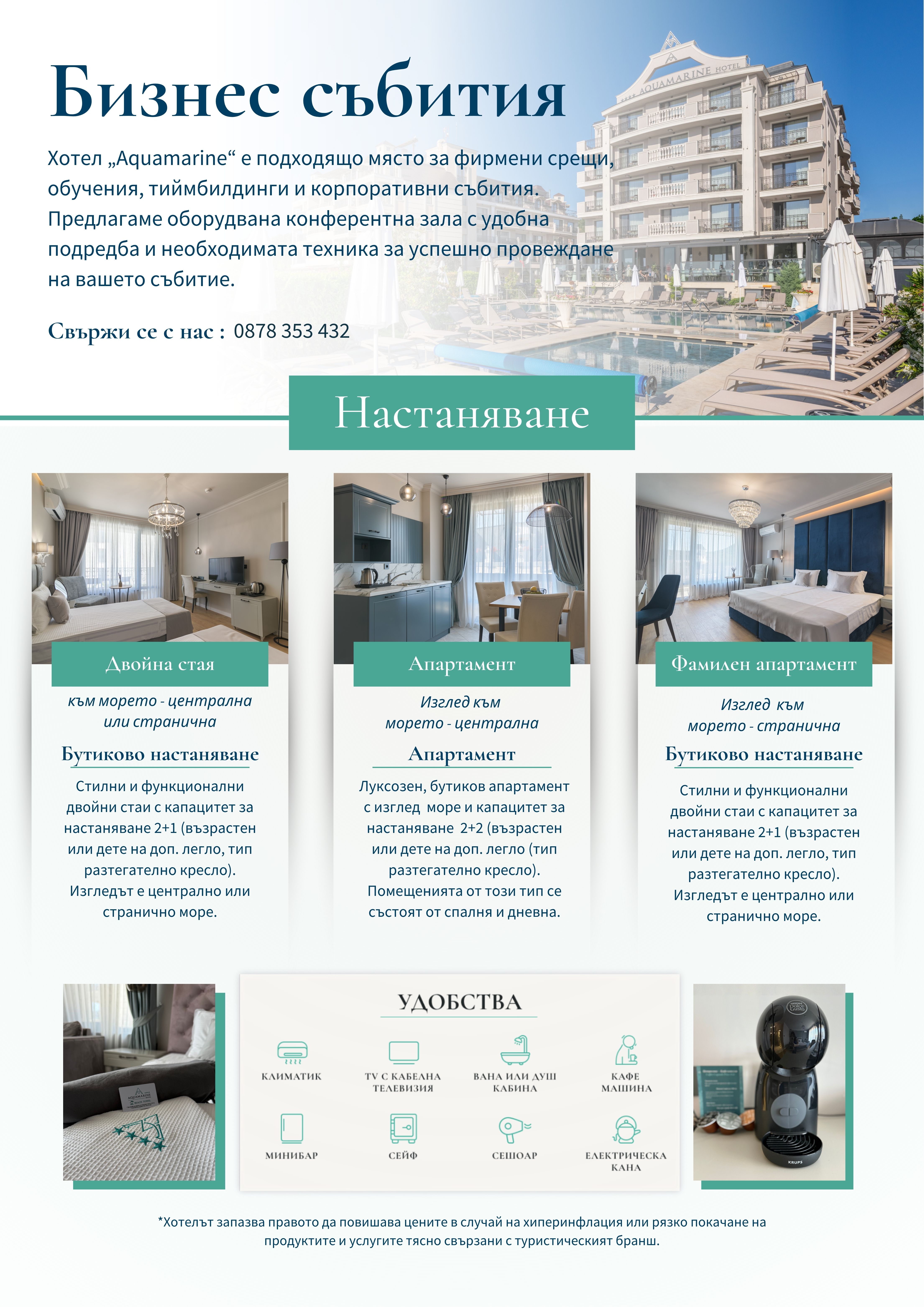 Hotelul Aquamarine este o alegere potrivită pentru întâlniri corporative, traininguri, team building și diverse evenimente de companie. Sala noastră de conferințe este dotată cu tehnologia necesară și poate fi adaptată în funcție de formatul evenimentului.